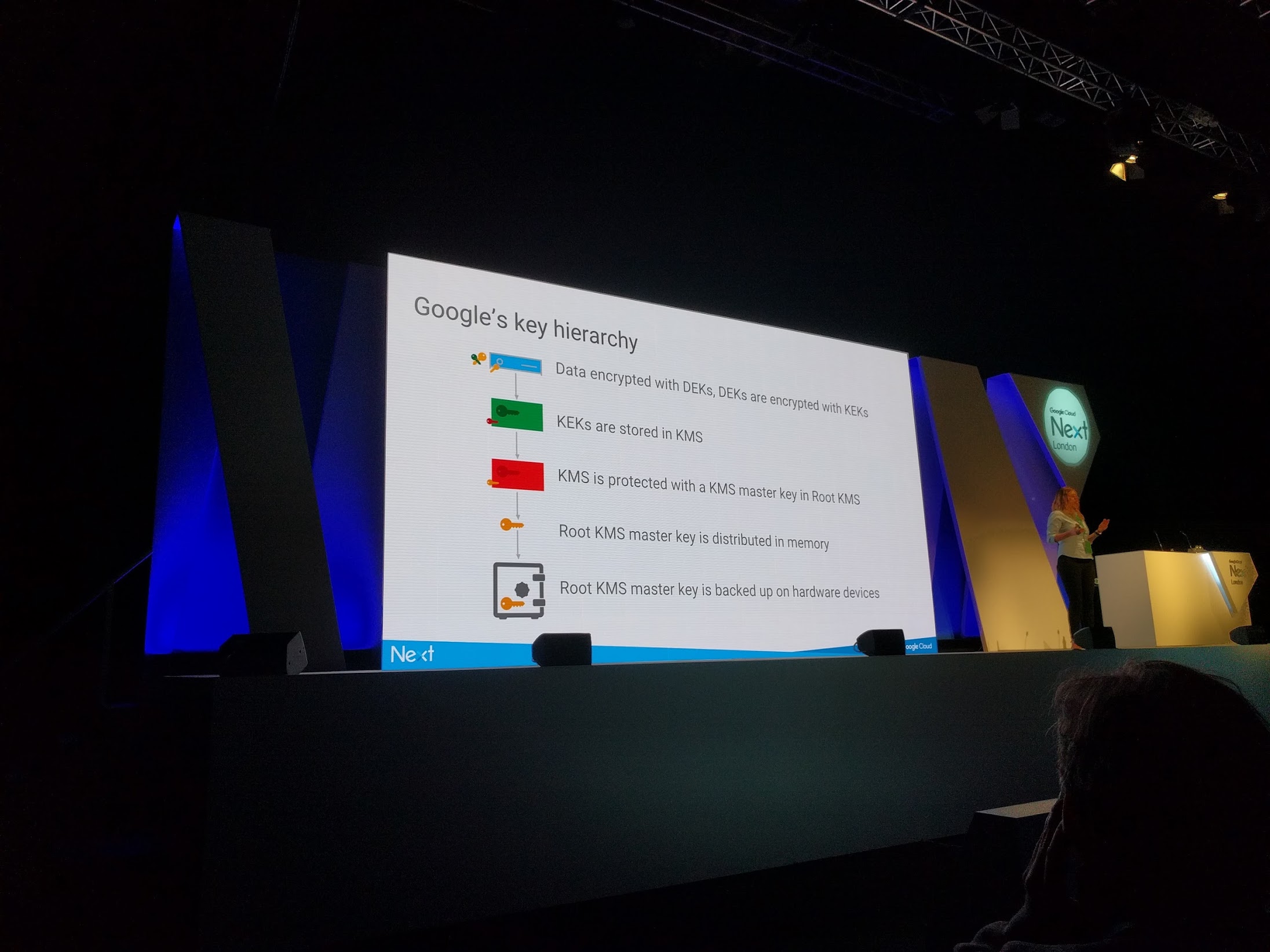 Once the opening keynote wrapped, I went to my first breakout session which was about encryption within GC. I’m not going to pretend I’m an expert in this field, but Maya Kaczorowski clearly is, and she is a security PM at Google. The process of encrypting data within the GC environment can be summarised thus :-