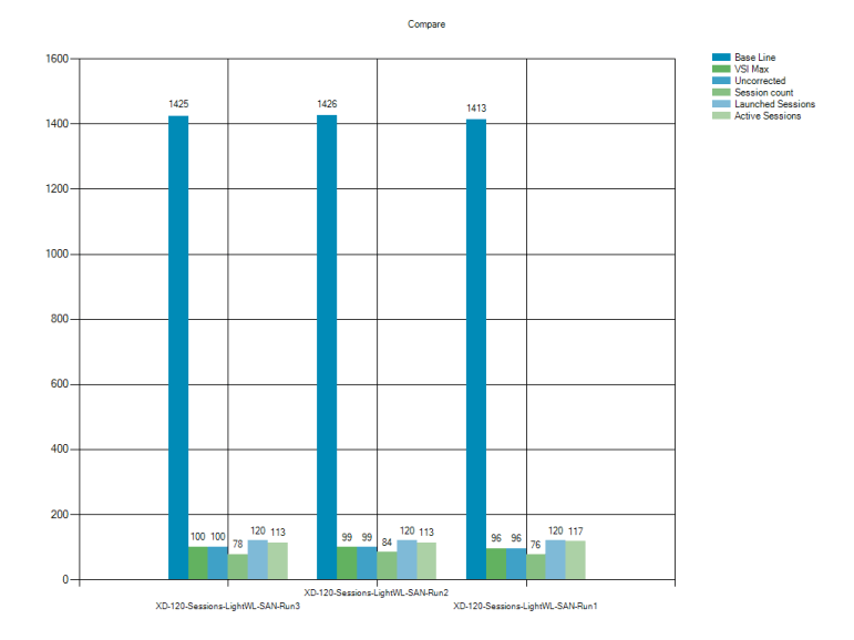 The VSIMax validates the design of the solution and gives both the solution architect and the end users/customers confidence that the VDI solution is fit for purpose. The graphic below shows the output from three tests run that validate the design for 100 desktops. You will need to install the VSI Analyser to compare the results, using the Comparison Wizard:-