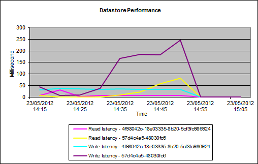 20GB of physical RAM is available in the ESXi host, and as we can see by the performance chart, memory is heavily utilised for most of the test but does not max out. So taking into account CPU and memory performance during the testing, we have enough spare capacity in these resources to service 100 virtual desktops. We’re making good progress in ruling out the performance bottleneck, but we haven’t found it yet! Onwards to the datastore performance charts!