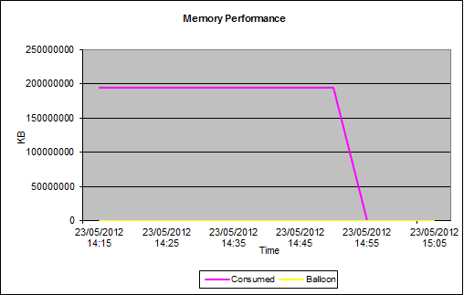 To continue the investigation, we now need to take a look at the memory resource to see if this is the constraining resource. As we can see from the chart, again memory is not the issue. Although the memory usage hovers around maximum, it is a little below.