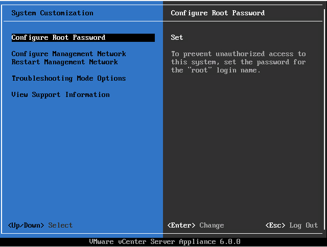 Once the install is completed, you may like to perform some housekeeping before you put the appliance into production. By default, my appliance came up with the DNS name localhost. I don’t really want that, so I quickly logged into the appliance console to change it. Something you may notice that’s new is that the vCenter appliance has now been set to behave just like an ESXi host, so once you press F2 to customise the system and entered the root password, the menu structure should be something that’s pretty familiar:-