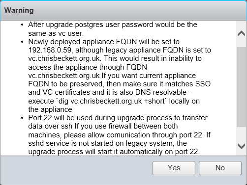 Once the credentials have been accepted, take care to check the information presented to you on what happens post upgrade. The new appliance will inherit the old appliance’s IP address. Also make sure no firewalls prevent SSH access between both appliances as this is the transfer method used during the migration/upgrade. The installer will start the SSH process will be started on the source appliance if it is not already running. Click Yes:-