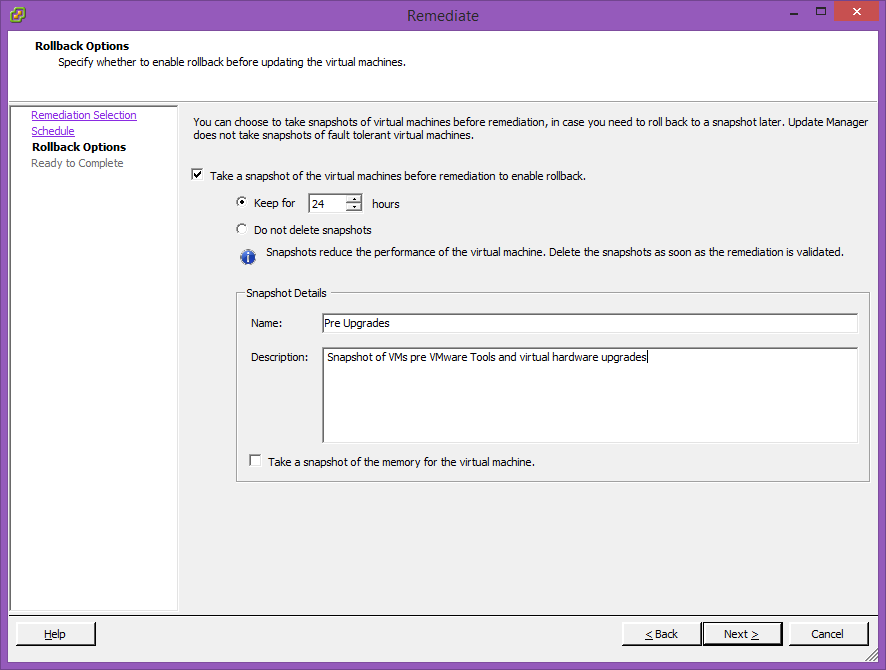 For full information of the pros and cons of either method, please refer to the product documentation. I’m not going to go into that level of detail here. What is reassuring for me with my one host and a dozen VMs is the following comment in the documentation:-