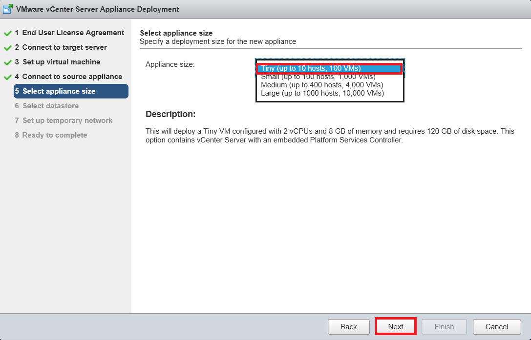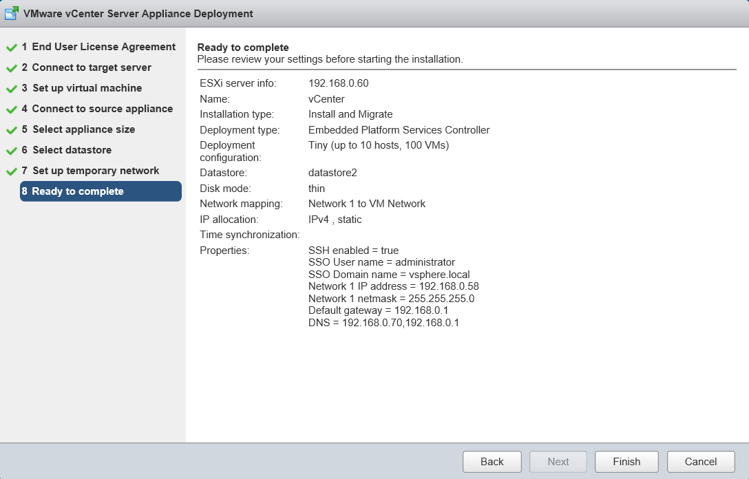 Step 8 is the “Ready to complete” or final sanity check. Review the information presented and check for typos, wrong IP addresses, what size appliance you need (sometimes “Tiny” just ain’t enough!) and when you’re happy, click Finish:-