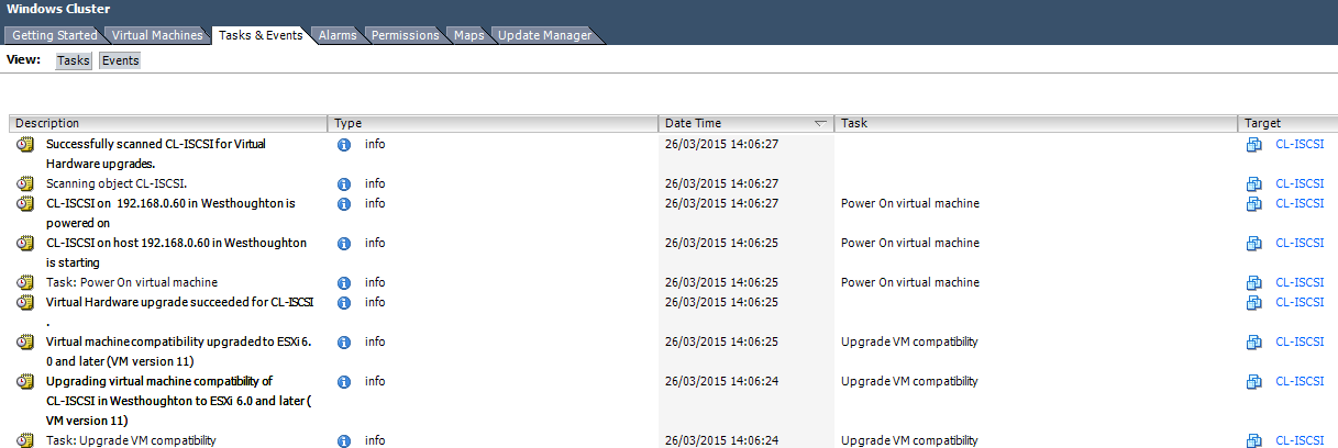 You can also monitor what is going on by connecting to the ESXi host with your vSphere Client and clicking on the “Events” tab of your target appliance, you should see something similar to below:-